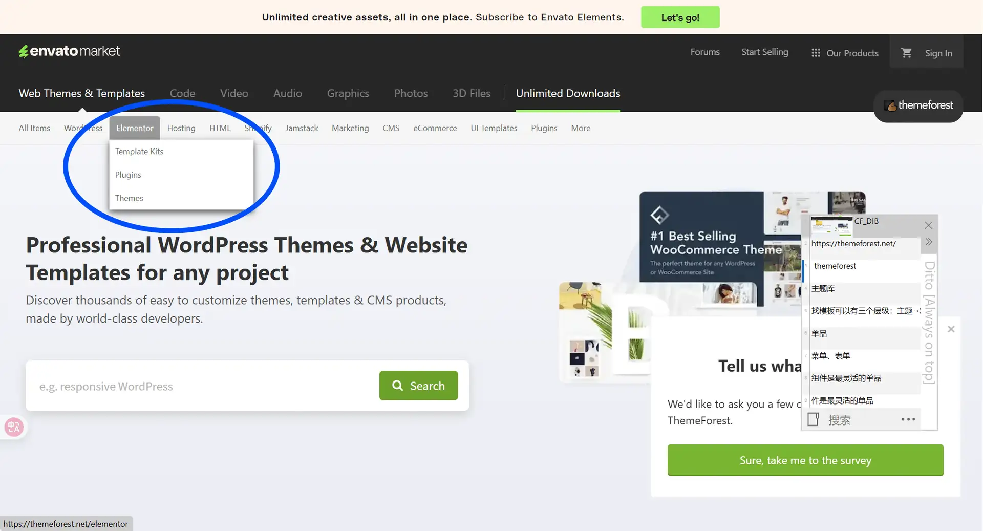 在Themeforest官网导航至Elementor选项卡,然后选择”Themes”(主题)类别,您将发现丰富多样的专业设计模板。这里汇集了各类精美主题,适合不同行业和风格需求。